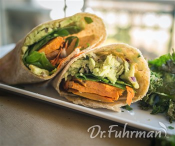 Spread avocado mixture on wraps. Place sweet potatoes, carrots, Romaine and non-dairy cheese on top and roll up. Cut wrap in half and enjoy with your favorite salad or veggies.